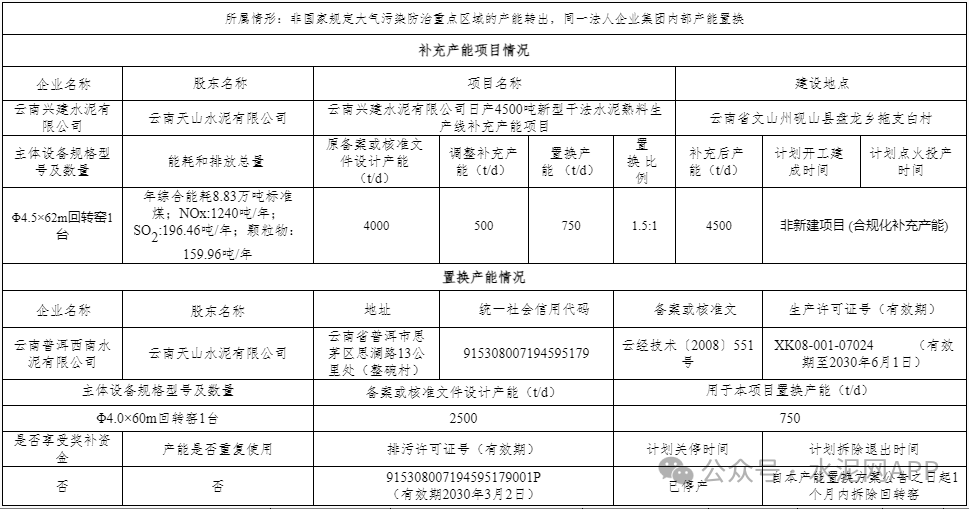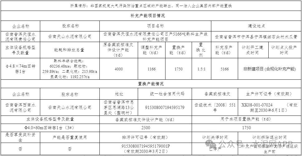 云南遠(yuǎn)東水泥退出一條2500t/d熟料生產(chǎn)線,其中1800t/d產(chǎn)能用于補(bǔ)充華坪縣定華能源建材一條2000t/d熟料線,補(bǔ)齊后產(chǎn)能3200t/d。置換比例1.5:1。