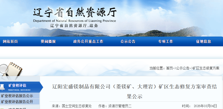根據(jù)《土地復(fù)墾條例》和《遼寧省地質(zhì)環(huán)境保護(hù)條例》有關(guān)要求,我廳委托自然資源事務(wù)服務(wù)中心組織專家對《遼陽宏盛鎂制品有限公司(菱鎂礦、大理巖)礦區(qū)生態(tài)修復(fù)方案》進(jìn)行了審查?,F(xiàn)將擬同意通過的該方案及專家評審意見進(jìn)行公示,公示期自發(fā)布之日起5個工作日。