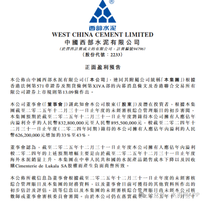 西部水泥3月4日晚間發(fā)布公告,集團(tuán)預(yù)期于截至2025年12月31日止年度將錄得公司擁有人應(yīng)占年內(nèi)溢利約人民幣8.33億元至人民幣8.95億元,較截至2024年12月31日止年度(2024年同期)錄得的公司擁有人應(yīng)占年內(nèi)溢利約人民幣6.26億元增加約33%至43%。