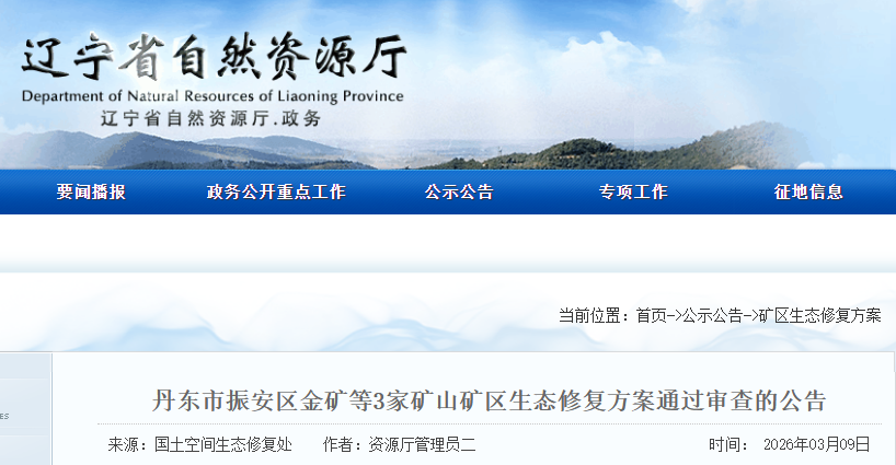 根據(jù)《土地復(fù)墾條例》和《遼寧省地質(zhì)環(huán)境保護(hù)條例》有關(guān)要求,丹東市振安區(qū)金礦、寬甸智國新軍礦業(yè)有限公司小湯石硼礦、海城鎂礦集團(tuán)有限公司海城鎂礦礦區(qū)生態(tài)修復(fù)方案通過審查,現(xiàn)予公告。