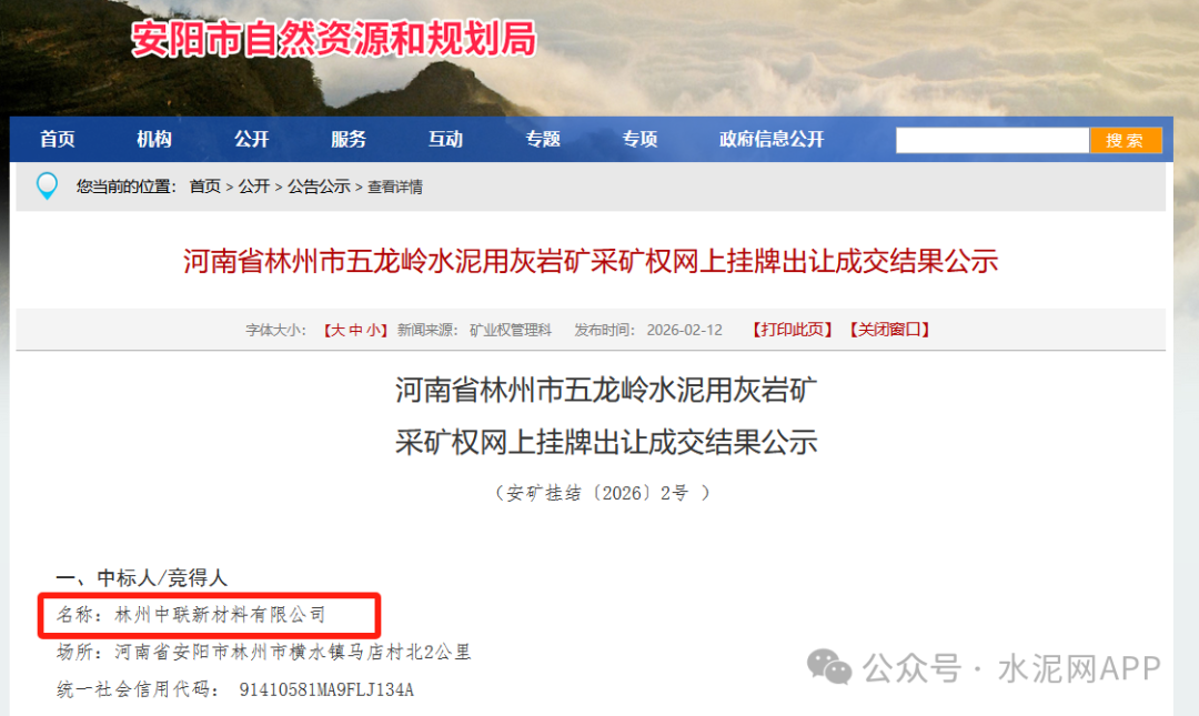 日前,河南安陽市自然資源和規(guī)劃局發(fā)布林州市五龍嶺水泥用灰?guī)r礦采礦權(quán)掛牌出讓成交結(jié)果,安陽中聯(lián)水泥全資子公司林州中聯(lián)新材料有限公司底價(jià)1.67億元競得該礦權(quán)。