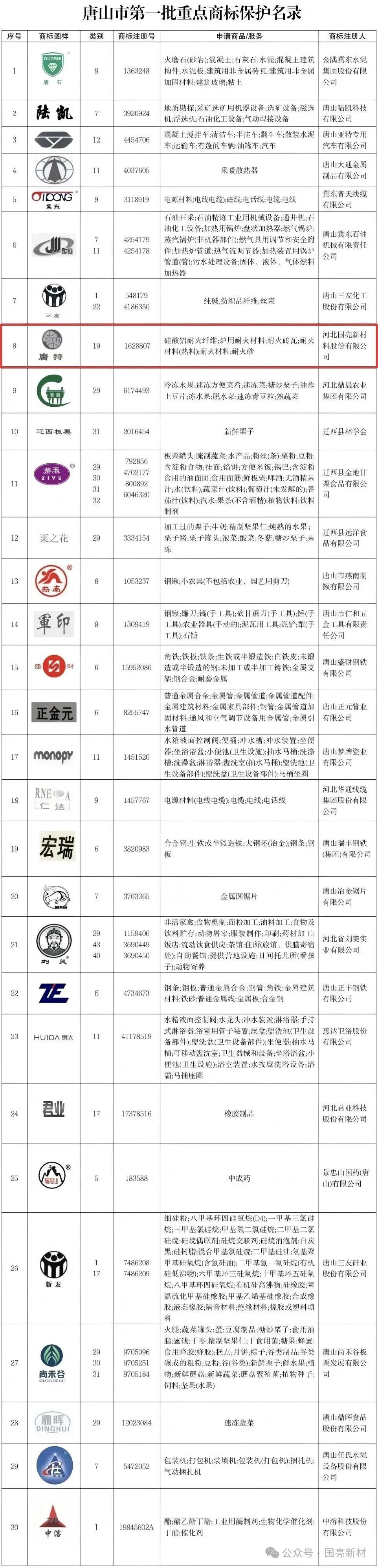 近日,唐山市市場監(jiān)管局(知識產(chǎn)權(quán)局)正式發(fā)布《唐山市第一批重點(diǎn)商標(biāo)保護(hù)名錄》,河北國亮新材料股份有限公司(簡稱“國亮新材”)的“唐特”商標(biāo)憑借深厚的品牌底蘊(yùn)、突出的市場影響力及完善的商標(biāo)保護(hù)體系,成功入選該名錄,標(biāo)志著公司在品牌保護(hù)與知識產(chǎn)權(quán)戰(zhàn)略層面獲重要權(quán)威認(rèn)可。