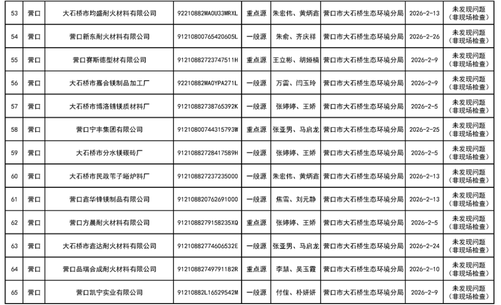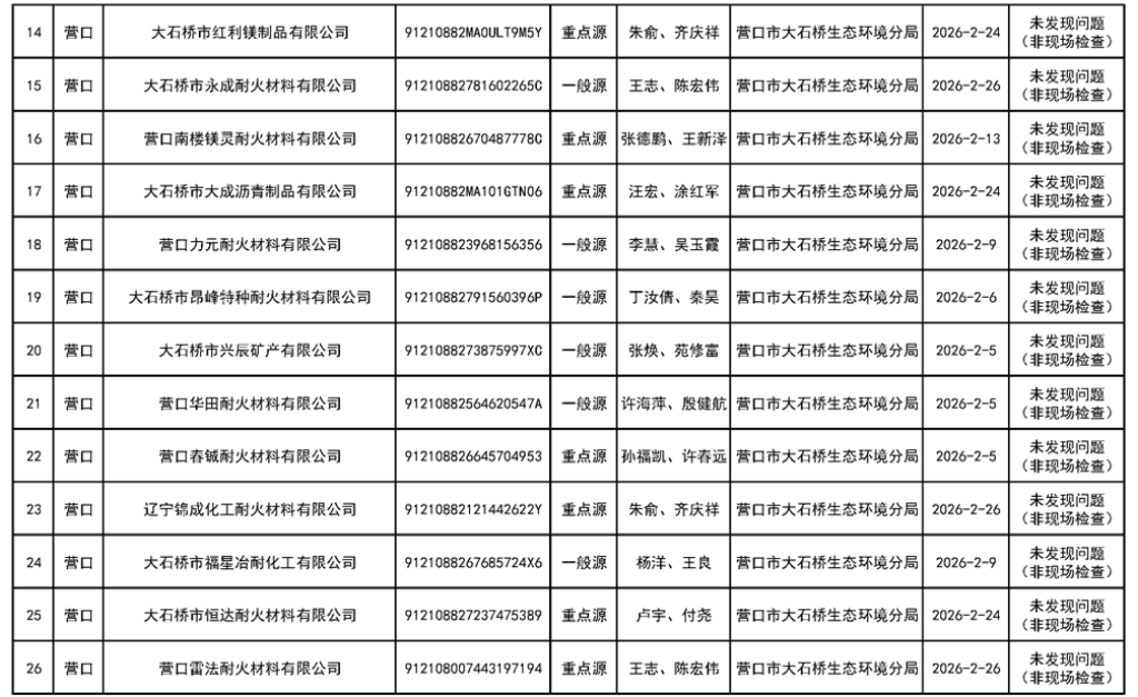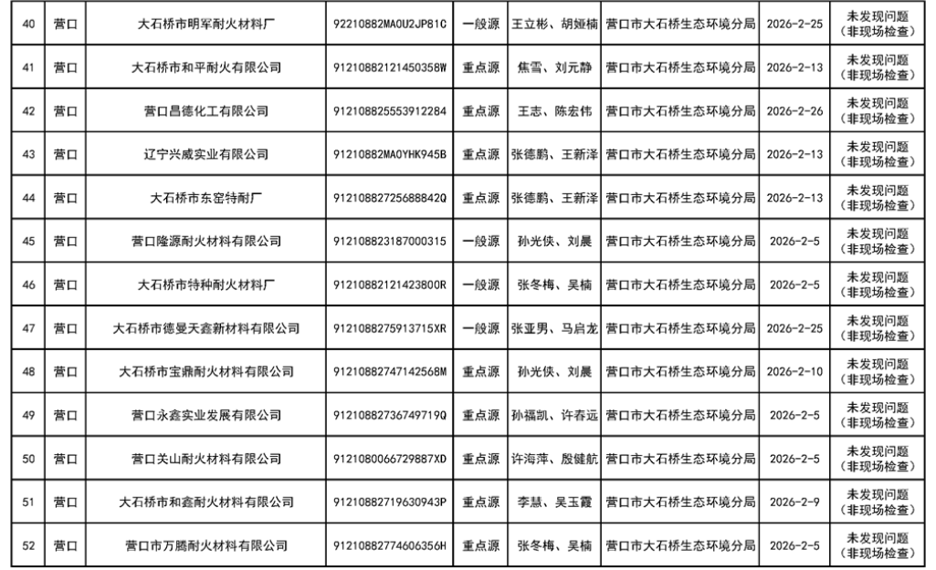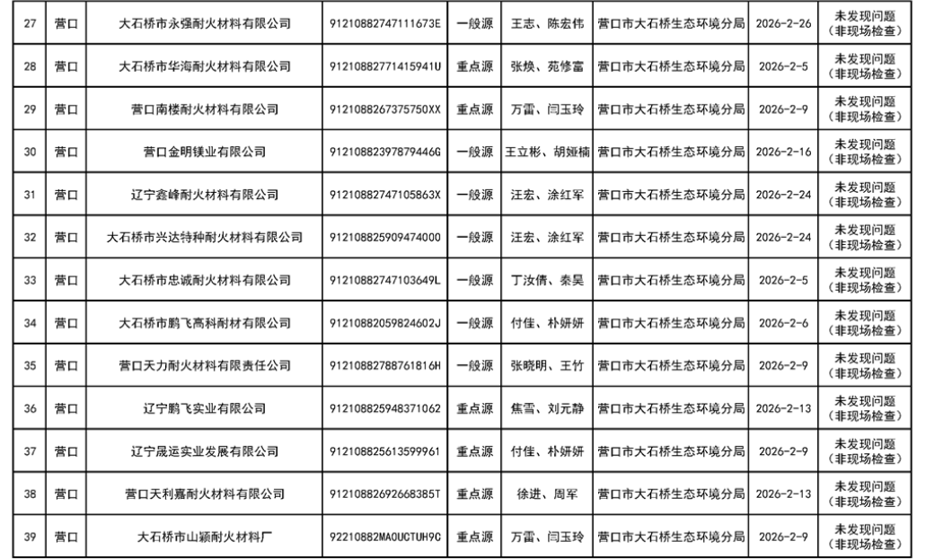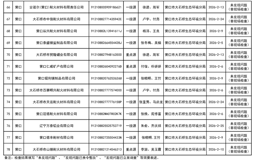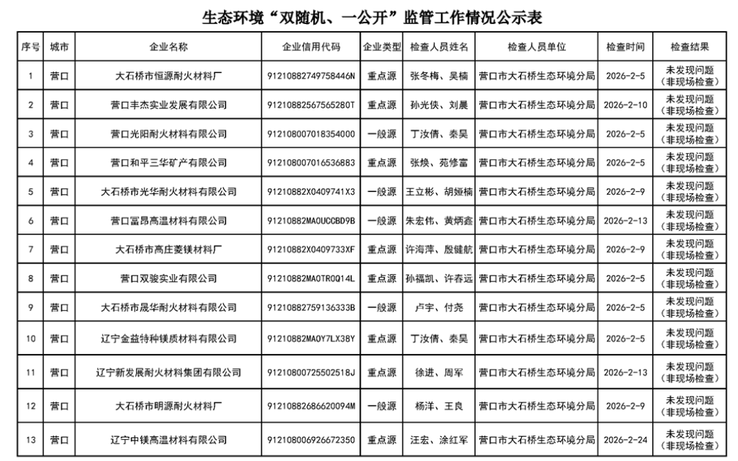 營口市生態(tài)環(huán)境局公示對大石橋恒源耐火、豐杰實(shí)業(yè)、光陽耐火等78家企業(yè)“雙隨機(jī)、一公開”監(jiān)管工作情況