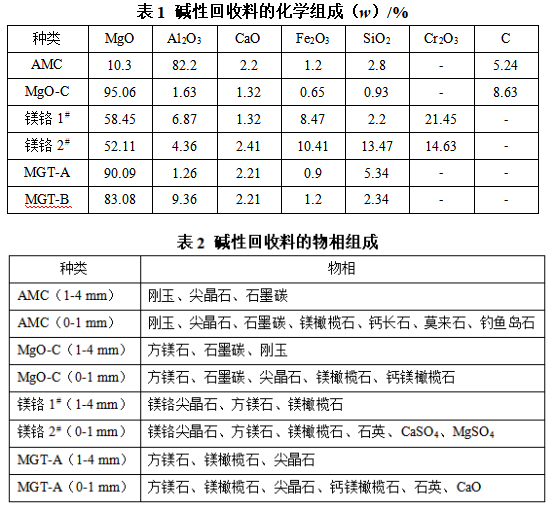 通過目視檢查,將超過50 mm的料塊與渣層分離,并通過洗滌、干燥、煅燒和磁選除鐵,得到不同類型的回收料,其化學組成和物相組成分別見表1和表2??梢钥闯?,回收料中1-4 mm骨料中雜質(zhì)含量較少。