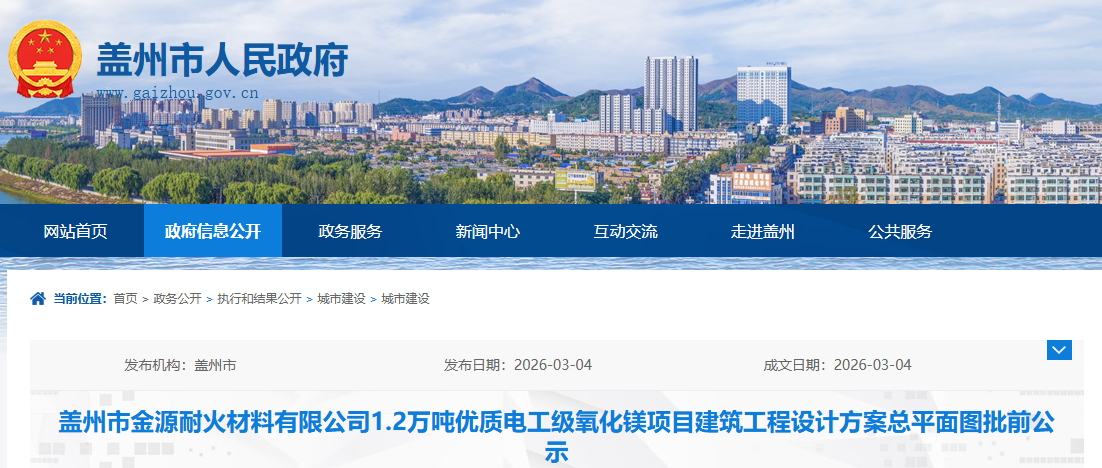蓋州市金源耐火材料有限公司(2025年1月6日變更為蓋州市匯佳耐火材料有限公司)1.2萬噸優(yōu)質(zhì)電工級(jí)氧化鎂項(xiàng)目,規(guī)劃用地性質(zhì)為工業(yè)用地,項(xiàng)目用地面積為15942平方米?,F(xiàn)建設(shè)單位已委托設(shè)計(jì)單位按照相關(guān)技術(shù)標(biāo)準(zhǔn)和規(guī)范優(yōu)化完善了建設(shè)工程規(guī)劃設(shè)計(jì)方案,現(xiàn)將規(guī)劃設(shè)計(jì)方案予以公示并公開征求相關(guān)厲害關(guān)系人意見。