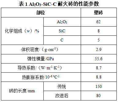 福山區(qū)2#煉鋼廠的鐵水包主要承接高爐鐵水,并通過(guò)機(jī)械攪拌脫硫后,轉(zhuǎn)移到煉鋼轉(zhuǎn)爐進(jìn)行冶煉。鐵水包上部空置區(qū)域的包璧不與鐵水直接接觸,僅遭受鐵水熱輻射作用,通常采用氧化鋁質(zhì)耐火材料,渣線及下部區(qū)域與包底遭受侵蝕較嚴(yán)重,主要采用Al2O3-SiC-C耐火磚,性能見(jiàn)表1。鐵水包損毀主要是由工作襯剝落(包括熱剝落、結(jié)構(gòu)剝落及機(jī)械剝落)導(dǎo)致的,其中剝落嚴(yán)重的部位在工作襯側(cè)壁,反復(fù)的熱膨脹導(dǎo)致耐火磚出現(xiàn)裂紋,引起襯磚的脫落,常需要進(jìn)行修補(bǔ)。