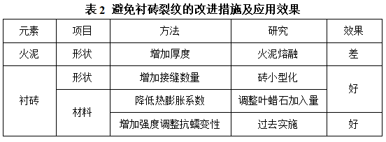 通過(guò)分析襯磚損毀機(jī)理,采取相應(yīng)改進(jìn)措施,見(jiàn)表2,并進(jìn)行相應(yīng)的應(yīng)用效果評(píng)估。通過(guò)改進(jìn)火泥及耐火磚參數(shù)來(lái)降低襯磚服役過(guò)程中產(chǎn)生的應(yīng)力集中度。可以看出,由于火泥的耐用性不如耐火磚,因此增加火泥厚度達(dá)不到預(yù)期效果。減小耐火磚的尺寸后(磚長(zhǎng)由150 mm減小為80 mm),火泥接縫數(shù)量增加。通過(guò)模擬計(jì)算承接高溫鐵水時(shí)磚縫增加前后磚中應(yīng)力值對(duì)比可知,磚縫增加后,磚中最大主應(yīng)力指數(shù)下降50%,最小主應(yīng)力指數(shù)下降30%,應(yīng)力分布更均勻,可有效避免磚中裂紋的產(chǎn)生。