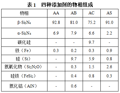 在本研究中,采用四種不同的添加劑,分別標記為AS、AA、AB和AC,其中AS為常規(guī)添加劑,用作對比;AA、AB和AC為三種特種添加劑。利用MasterSizer 2000粒度分析儀對添加劑的粒度分布(PSD)進行了分析,結(jié)果如圖1所示。從圖1可以看出,常規(guī)添加劑(AS)的粒度明顯更細,其d10、d50和d90值均低于特殊添加劑。在這些特殊添加劑中,添加劑AC的粒度分布最寬,表明其粒度范圍更廣。此外,利用XRD分析了四種添加劑的相組成,結(jié)果如表1所示。與其他添加劑相比,添加劑AA含有相對較高的氮化硅(Si3N4);除了氮化硅外,添加劑AB還含有較高含量的金屬硅(Si),添加劑AC還含有一定量的金屬硅和碳化硅(SiC)。