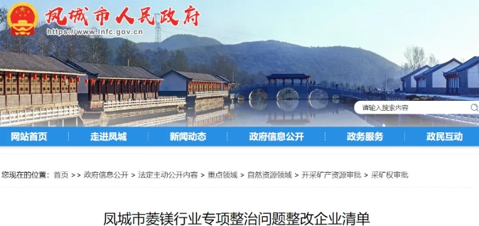 近日,鳳城市政府在官網(wǎng)公布了《鳳城市菱鎂行業(yè)專(zhuān)項(xiàng)整治問(wèn)題整改企業(yè)清單》,其中擬關(guān)閉企業(yè)2家,擬整改企業(yè)39家。附件為整改企業(yè)清單,下載附件可查看整改企業(yè)詳細(xì)信息。