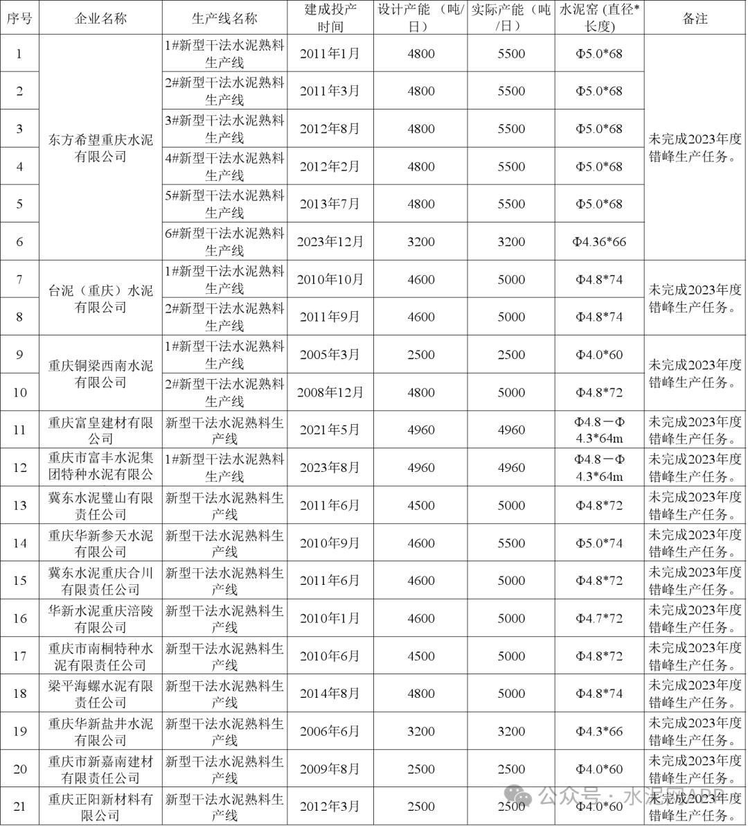 根據(jù)公示清單,截至2023年12月31日,重慶市共計47條水泥熟料生產(chǎn)線,其中:14家企業(yè)21條生產(chǎn)線未完成2023年度錯峰生產(chǎn)任務;8條生產(chǎn)線已公告將搬遷。未完成2023年度錯峰生產(chǎn)任務清單