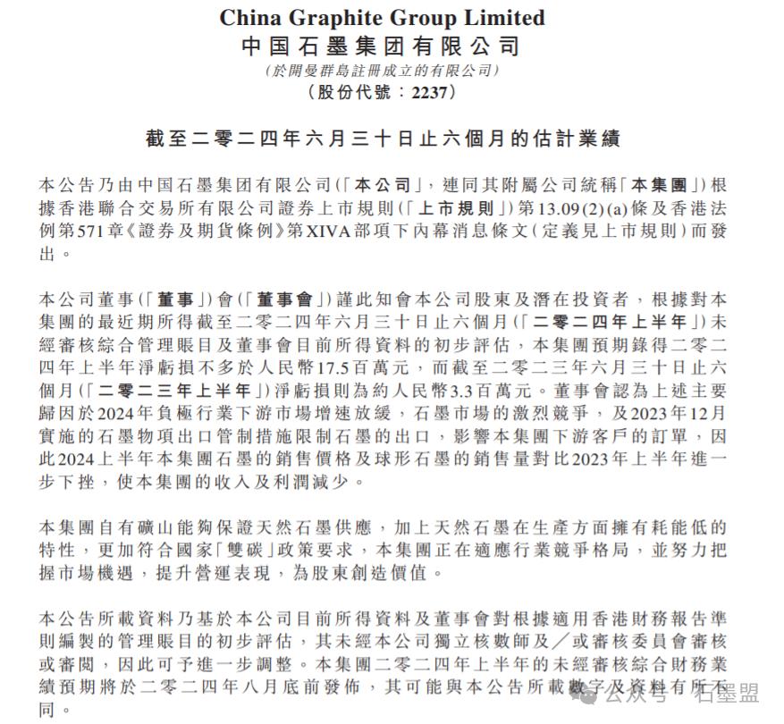 董事會認為上述主要歸因于2024年負極行業(yè)下游市場增速放緩,石墨市場的激烈競爭,及2023年12月實施的石墨物項出口管制措施限制石墨的出口,影響集團下游客戶的訂單,因此2024上半年集團石墨的銷售價格及球形石墨的銷售量對比2023年上半年進一步下挫,使集團的收入及利潤減少。集團自有礦山能夠保證天然石墨供應,加上天然石墨在生產方面擁有耗能低的特性,更加符合國家「雙碳」政策要求,集團正在適應行業(yè)競爭格局,并努力把握市場機遇,提升營運表現(xiàn),為股東創(chuàng)造價值。