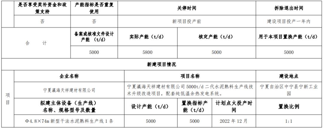 其中,包括中衛(wèi)市寧夏瀛海天祥建材有限公司2條2500t/d熟料生產(chǎn)線,退出產(chǎn)能合計150萬噸。