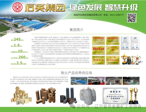 海城市后英集團始建于1983年,是國內大一型企業(yè)集團公司,企業(yè)涵蓋鎂質耐火、滑石、鋼鐵、地產(chǎn)、物流、糧油加工等多個領域。集團公司目前擁有資產(chǎn)245億元,職工16000人,近10年來每年上繳稅金均在10億元以上。2022年實現(xiàn)銷售收入260億元、上繳稅金14億元、出口創(chuàng)匯2.5億美元。