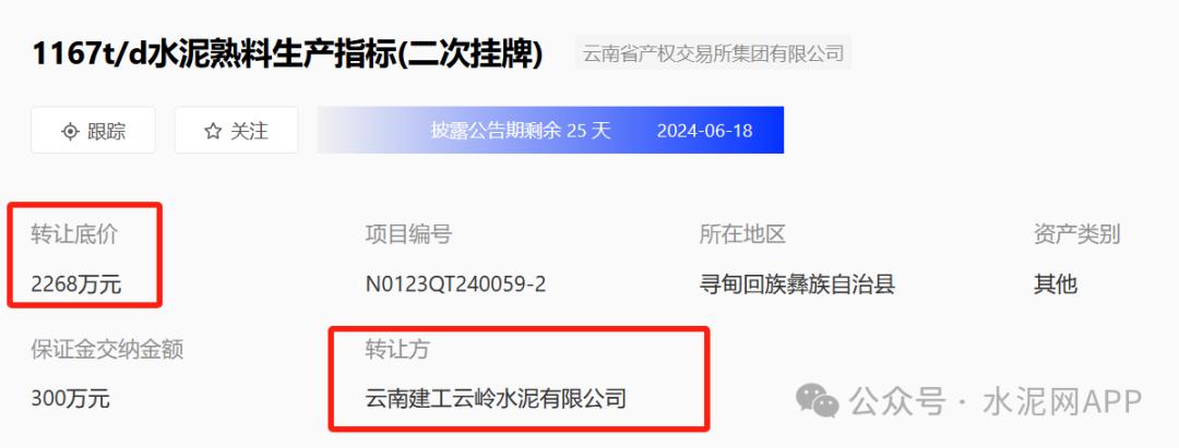 據(jù)某產(chǎn)權(quán)交易平臺(tái)顯示,云南建工云嶺水泥有限公司掛牌出讓1167t/d水泥熟料生產(chǎn)指標(biāo)。據(jù)披露顯示,其轉(zhuǎn)讓底價(jià)為2268萬元。首次轉(zhuǎn)讓低價(jià)為2520萬元。