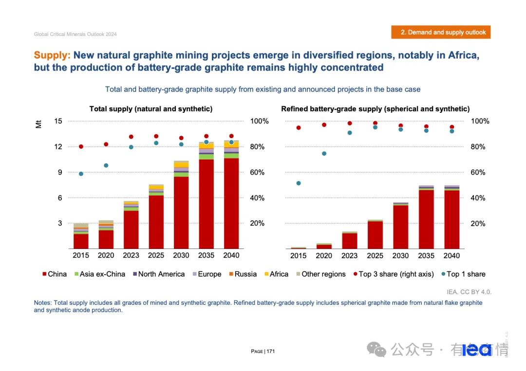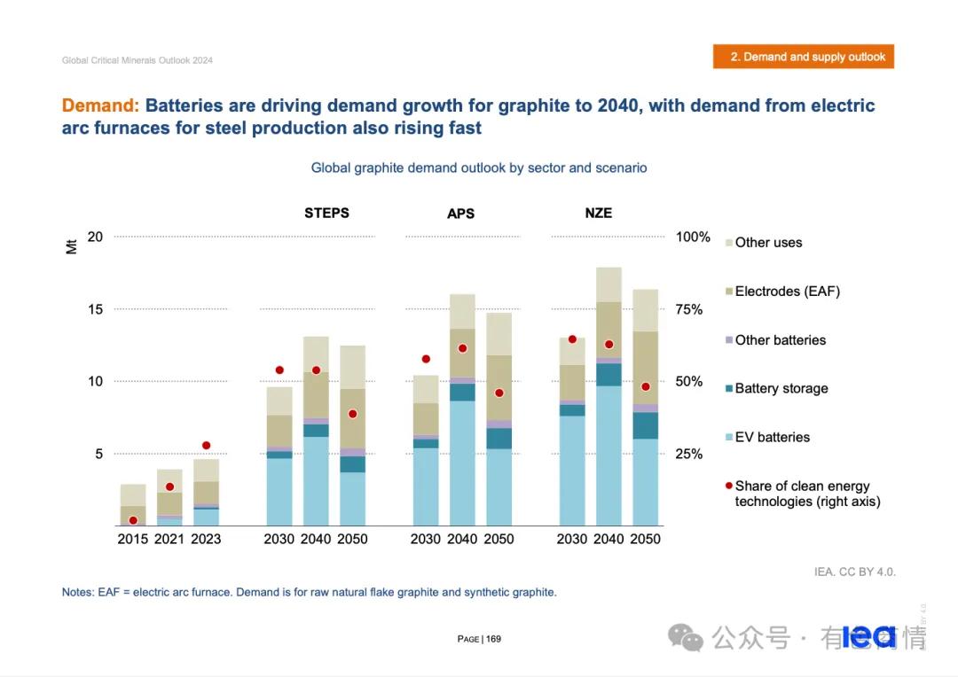 需求增長和驅動因素需求增長:2023年,石墨消費量增長了11%,達到460萬噸,其中電池相關需求增長了40%,達到150萬噸。未來預測:在凈零排放(NZE)情景下,石墨需求到2040年幾乎增加四倍。