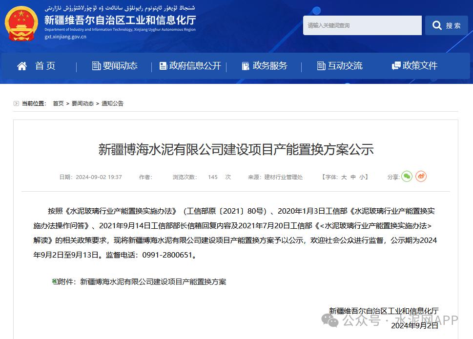 9月2日,新疆工信廳發(fā)布“新疆博海水泥有限公司建設(shè)項(xiàng)目產(chǎn)能置換方案公示”。