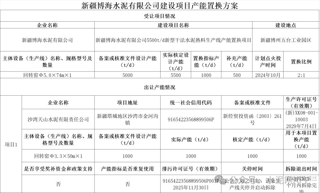 置換方案表顯示,沙灣天山水泥有限責(zé)任公司出讓1000t/d熟料產(chǎn)能,用于新疆博海水泥有限公司5500t/d水泥熟料生產(chǎn)線置換項(xiàng)目,補(bǔ)充500t/d產(chǎn)能。