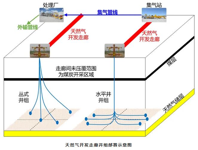 中國煤科武漢設(shè)計院科研團(tuán)隊從綜合確保兩種資源高采出率的全新視角出發(fā),統(tǒng)籌構(gòu)建了煤-氣協(xié)同安全開發(fā)的頂層規(guī)劃。與煤炭大規(guī)模采掘煤層不同,天然氣開發(fā)依賴于部署開發(fā)井組回收地層中的氣體。課題小組提出,將天然氣井口及管線在地面集中規(guī)劃成條帶狀,可以實現(xiàn)煤炭與天然氣協(xié)同開發(fā),并稱之為“天然氣開發(fā)走廊”。
