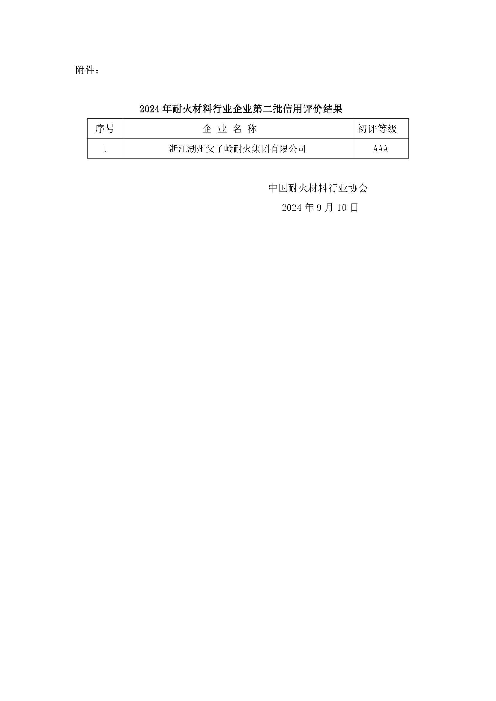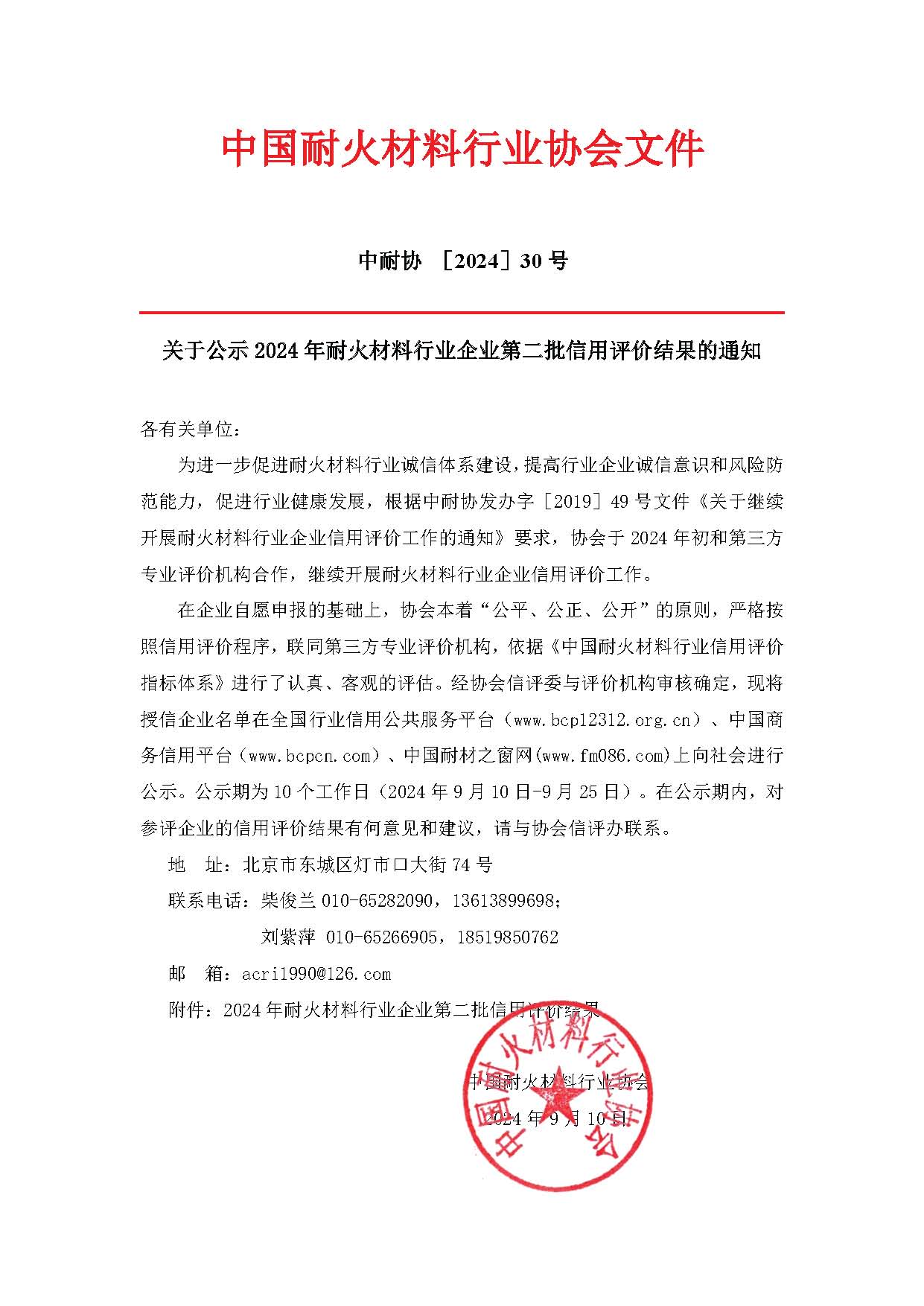 關(guān)于公示2024年耐火材料行業(yè)企業(yè)第二批信用評價(jià)結(jié)果的通知