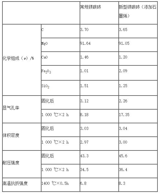 表1 新型鎂碳磚與常規(guī)鎂碳的理化指標(biāo)對(duì)比