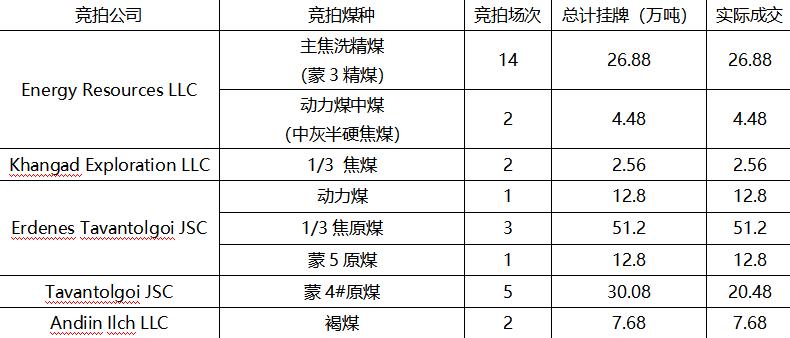 截至10月24日,據(jù)統(tǒng)計(jì)數(shù)據(jù)顯示,蒙古在10月共進(jìn)行了30場(chǎng)線上競(jìng)拍,其中主流煤種Energy Resources LLC公司蒙3精煤共進(jìn)行了14場(chǎng)競(jìng)拍,總計(jì)掛牌26.88萬噸,實(shí)際26.88萬噸;Tavantolgoi JSC公司蒙4在本月共進(jìn)行了5場(chǎng)競(jìng)拍,總計(jì)掛牌30.08萬噸,實(shí)際成交20.48萬噸;Erdenes Tavantolgoi JSC公司在本月共進(jìn)行了5場(chǎng)競(jìng)拍,總計(jì)掛牌76.8萬噸,實(shí)際成交76.8萬噸,其中ETT公司蒙5原煤時(shí)隔半年進(jìn)行線上競(jìng)拍,掛牌12.8萬噸,全部成交,最后交貨時(shí)間2025年2月28日。