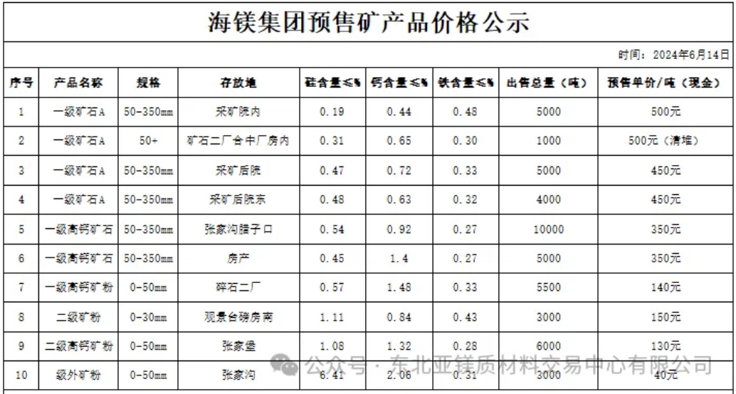 就在上周五下午,海鎂集團(tuán)在官網(wǎng)公示了其一級(jí)礦石A、一級(jí)高鈣礦石等礦產(chǎn)品理化指標(biāo)和預(yù)售價(jià)格,可以看到,個(gè)別礦產(chǎn)品預(yù)售價(jià)格較海鎂上月同期報(bào)價(jià)已經(jīng)有了一定的上浮。