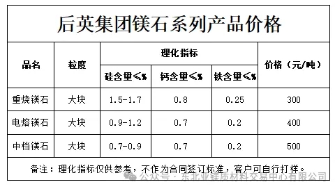今日,后英集團(tuán)也公布了最新的菱鎂礦石理化指標(biāo)及產(chǎn)品報(bào)價(jià),根據(jù)后英集團(tuán)發(fā)布的信息,本次更新的三種礦石較近期的市場價(jià)同樣有一定上浮。
