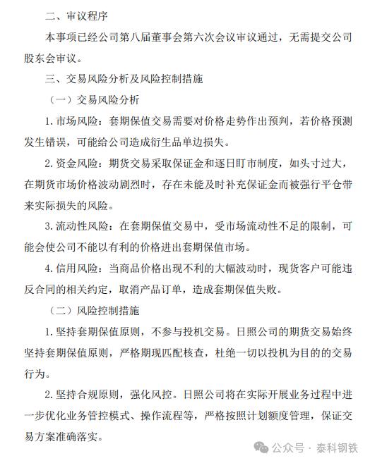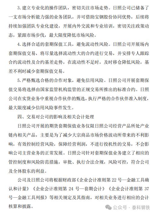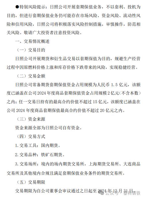 公告披露,山鋼日照常備期貨套期保值資金占用規(guī)模為1.5億元,該額度已涵蓋在該公司2024年度商品套期保值資金占用規(guī)模2億元(不含本數(shù))之內(nèi);任一交易日持有的最高合約價(jià)值不超過(guò)15億元,該額度已涵蓋在該公司2024年度商品套期保值最高合約價(jià)值不超過(guò)20億元之內(nèi)。該公司擬開(kāi)展商品類金融衍生品業(yè)務(wù)的品種為鐵礦石期貨,期貨交易以套期保值為目的,規(guī)避生產(chǎn)經(jīng)營(yíng)過(guò)程中因原燃料價(jià)格上漲和庫(kù)存價(jià)格下跌帶來(lái)的風(fēng)險(xiǎn),實(shí)現(xiàn)穩(wěn)健經(jīng)營(yíng)。