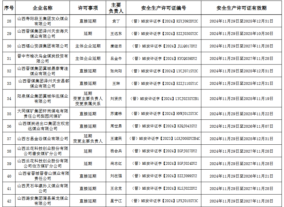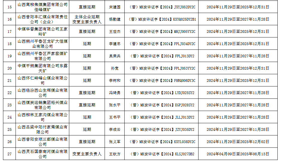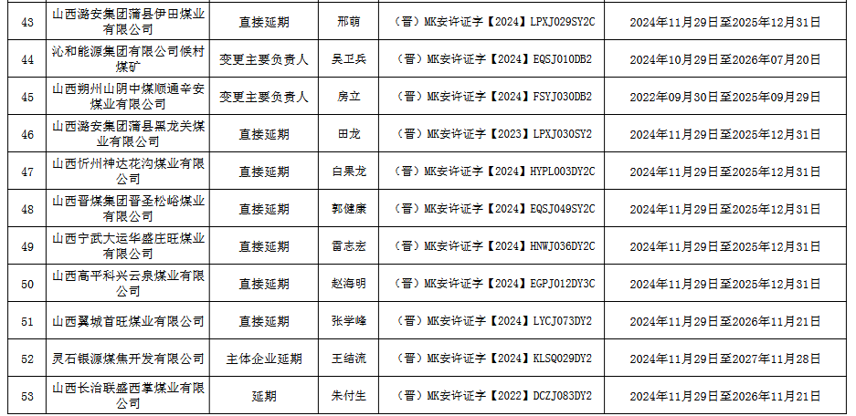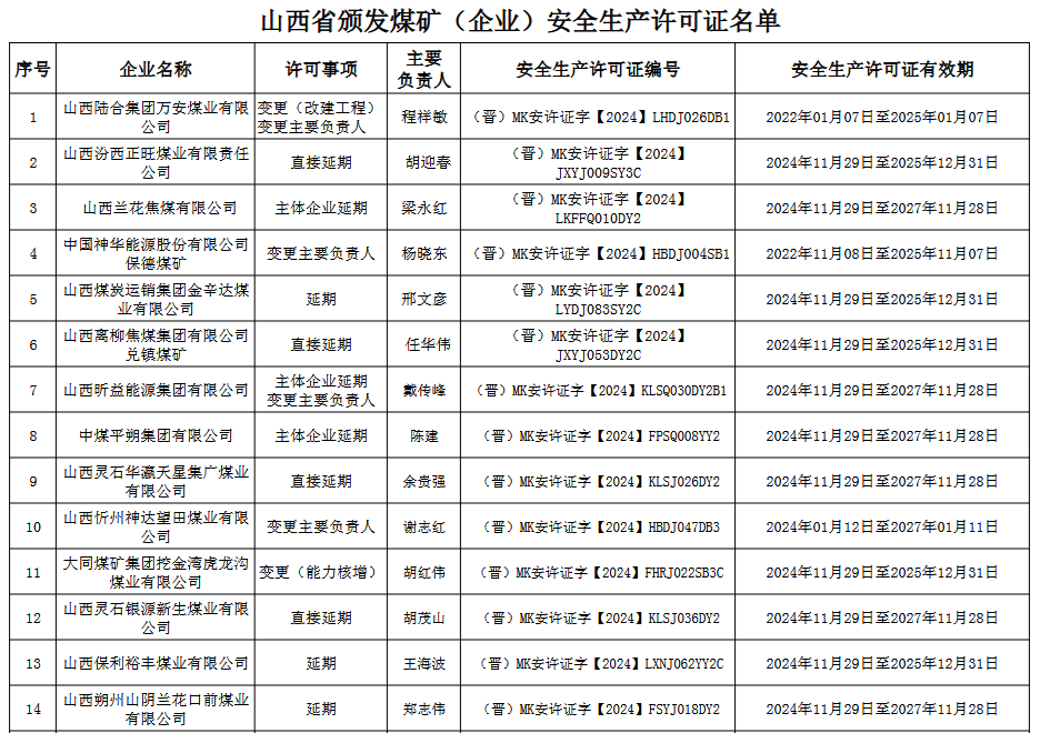 山西省應(yīng)急管理廳關(guān)于頒發(fā)煤礦(企業(yè))安全生產(chǎn)許可證的公告 經(jīng)研究,按照有關(guān)規(guī)定,為山西陸合集團(tuán)萬(wàn)安煤業(yè)有限公司等53座煤礦(企業(yè))頒發(fā)安全生產(chǎn)許可證,現(xiàn)進(jìn)行公告。 公告期:2024年11月30日至2024年12月06日。