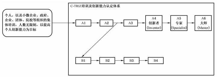 (1)A系列(C-TRIZ創(chuàng)新工程師系列),考核技術(shù)創(chuàng)新方法應(yīng)用與咨詢能力等級,具體分為A1、A2、A3、A4、A5、A6等級;(2)B系列(C-TRIZ創(chuàng)新培訓(xùn)師系列),考核技術(shù)創(chuàng)新方法培訓(xùn)能力等級,具體分為B1、B2、B3、B4等級。認(rèn)定指標(biāo)包括:理論知識掌握程度、實際應(yīng)用能力、推廣能力、咨詢與培訓(xùn)能力。認(rèn)定依據(jù)包括:理論考核、案例分析、創(chuàng)新成果展示、培訓(xùn)與指導(dǎo)記錄。