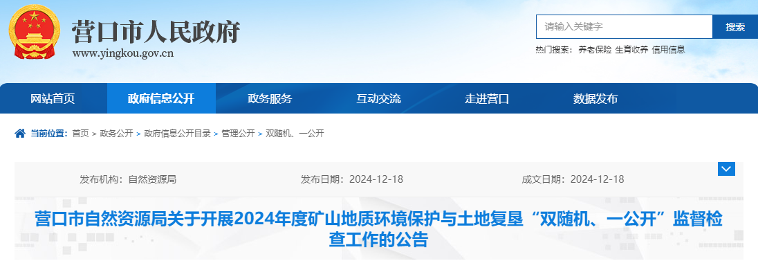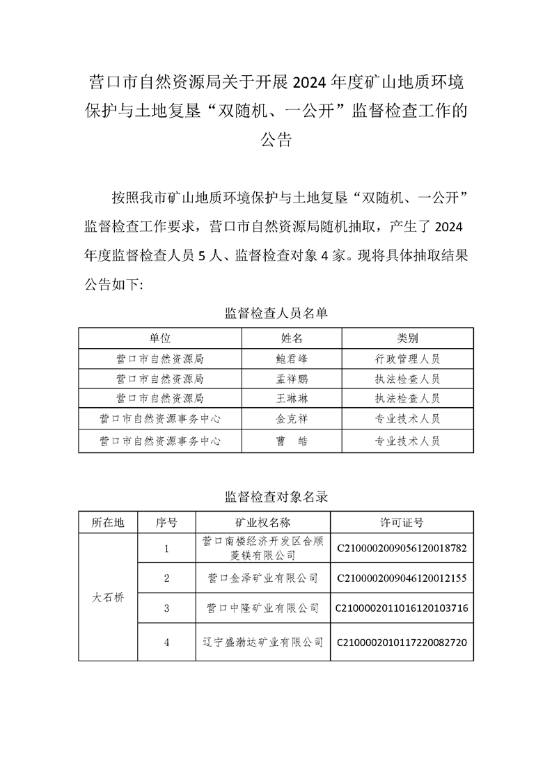 營口市自然資源局將對合順菱鎂礦、盛渤達(dá)礦業(yè)等4家礦企開展“雙隨機(jī)、一公開”監(jiān)督檢查工作