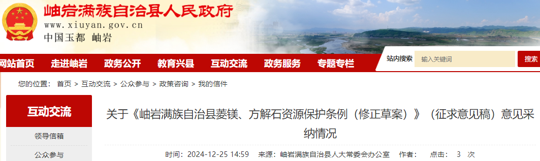 為進(jìn)一步增強(qiáng)立法的公開(kāi)性、透明度,提高立法質(zhì)量,《岫巖滿族自治縣菱鎂、方解石資源保護(hù)條例(修正草案)》(征求意見(jiàn)稿)在縣政府網(wǎng)站進(jìn)行了公示征求公眾意見(jiàn),公示時(shí)間為2024年12月9日至2024年12月25日,共15天。