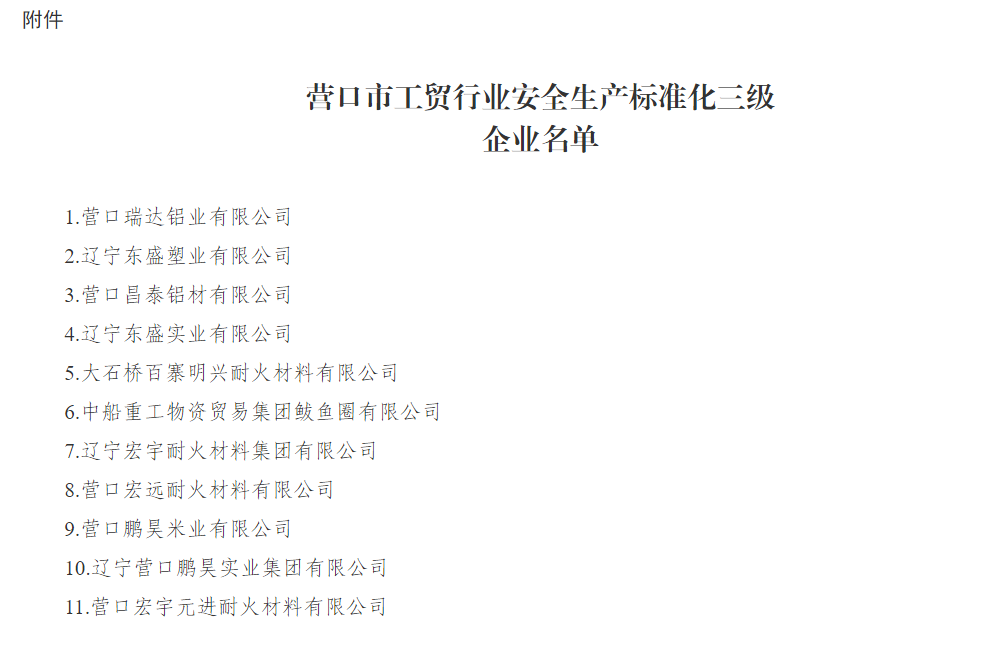 附件:營(yíng)口市工貿(mào)行業(yè)安全生產(chǎn)標(biāo)準(zhǔn)化三級(jí)企業(yè)名單