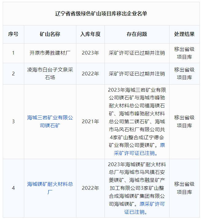 經(jīng)核實,開原市勇勝建材廠、凌海市白臺子文泉采石場、海城三巖礦業(yè)有限公司鎂石礦和海城鎂礦耐火材料總廠4家省級綠色礦山的采礦許可證已注銷。按照《遼寧省綠色礦山管理辦法》(遼自然資發(fā)〔2022〕62號)有關(guān)規(guī)定,現(xiàn)將上述4家公司移出省級綠色礦山項目庫。