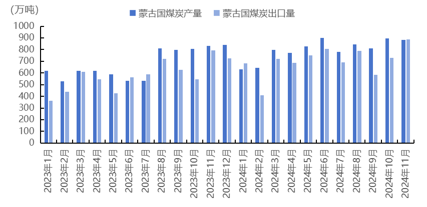 蒙古國(guó)國(guó)家統(tǒng)計(jì)辦公室發(fā)布最新統(tǒng)計(jì)數(shù)據(jù)顯示,11月蒙古國(guó)原煤產(chǎn)量883.1萬(wàn)噸,同比增速達(dá)5.6%,較上月893.9萬(wàn)噸相比減少10.8萬(wàn)噸,環(huán)比下降1.2%。2024年1-11月蒙古國(guó)煤炭產(chǎn)量累計(jì)為8992.68萬(wàn)噸,較上年同期相比增加1708.7萬(wàn)噸,同比增長(zhǎng)23.5%。其中,硬煤(Hard coal)產(chǎn)量累計(jì)7687.4萬(wàn)噸,同比增長(zhǎng)23.1%;褐煤(Brown coal)產(chǎn)量累計(jì)1305.3萬(wàn)噸,同比增長(zhǎng)25.8%。蒙古出口煤炭持續(xù)高速增長(zhǎng)態(tài)勢(shì),根據(jù)蒙古國(guó)海關(guān)外貿(mào)統(tǒng)計(jì)報(bào)告數(shù)據(jù)顯示,2024年1-11月蒙古已累計(jì)出口煤炭7737.53萬(wàn)噸,較上年同期相比增加1502.5萬(wàn)噸,增速達(dá)24.1%。其中,11月蒙古煤炭出口量達(dá)888.19萬(wàn)噸,同比增加11.7%,環(huán)比增加22.2%。
