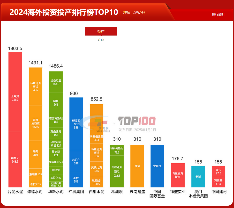 1月1日,中國(guó)水泥網(wǎng)發(fā)布“2024中國(guó)水泥熟料產(chǎn)能百?gòu)?qiáng)榜”,其中包含2024海外投資投產(chǎn)排行榜TOP10。榜單顯示,臺(tái)泥、海螺、華新位于前三。