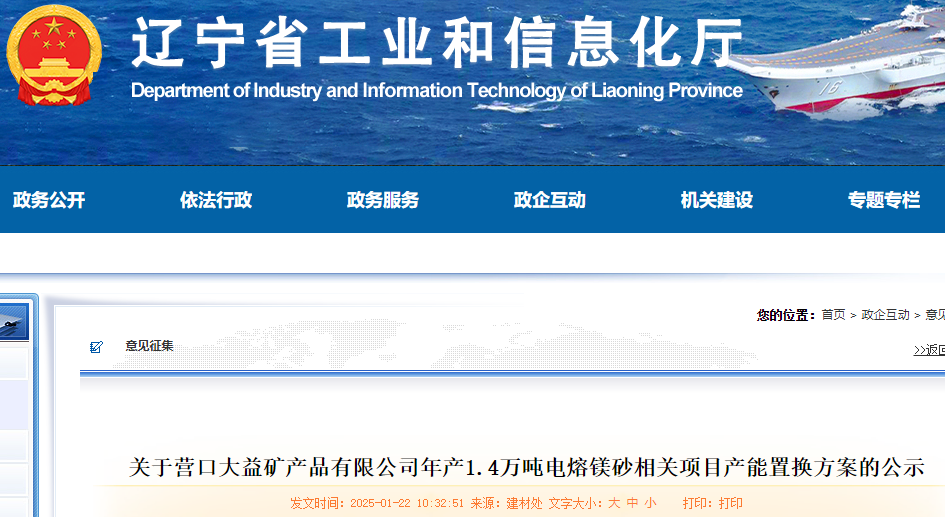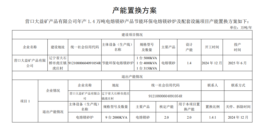 按照《遼寧省人民政府辦公廳關(guān)于推進菱鎂行業(yè)高質(zhì)量發(fā)展的實施意見》(遼政辦發(fā)〔2023〕15號)、《遼寧省菱鎂礦浮選及鎂砂行業(yè)產(chǎn)能置換辦法》(遼工信建材〔2024〕18號)要求,根據(jù)菱鎂行業(yè)專項整治工作進展,經(jīng)企業(yè)申請、市工信部門初審、省級現(xiàn)場復(fù)核,現(xiàn)將營口大益礦產(chǎn)品有限公司年產(chǎn)1.4萬噸電熔鎂砂產(chǎn)品節(jié)能環(huán)保電熔鎂砂爐及配套設(shè)施項目產(chǎn)能置換方案予以公示,公示期10個工作日。