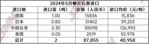 2024年5月,中國鱗片石墨進(jìn)口量為2噸,環(huán)比暴跌100%,同比減少100%。