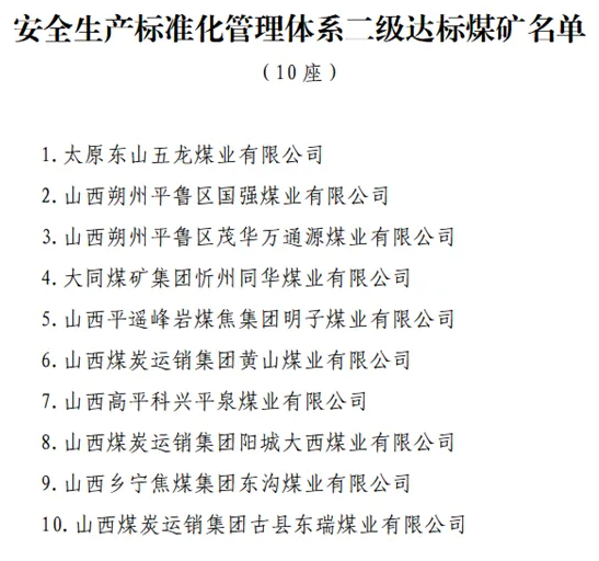 關(guān)于確認太原東山五龍煤業(yè)有限公司等10座煤礦為安全生產(chǎn)標準化管理體系二級達標煤礦的通知