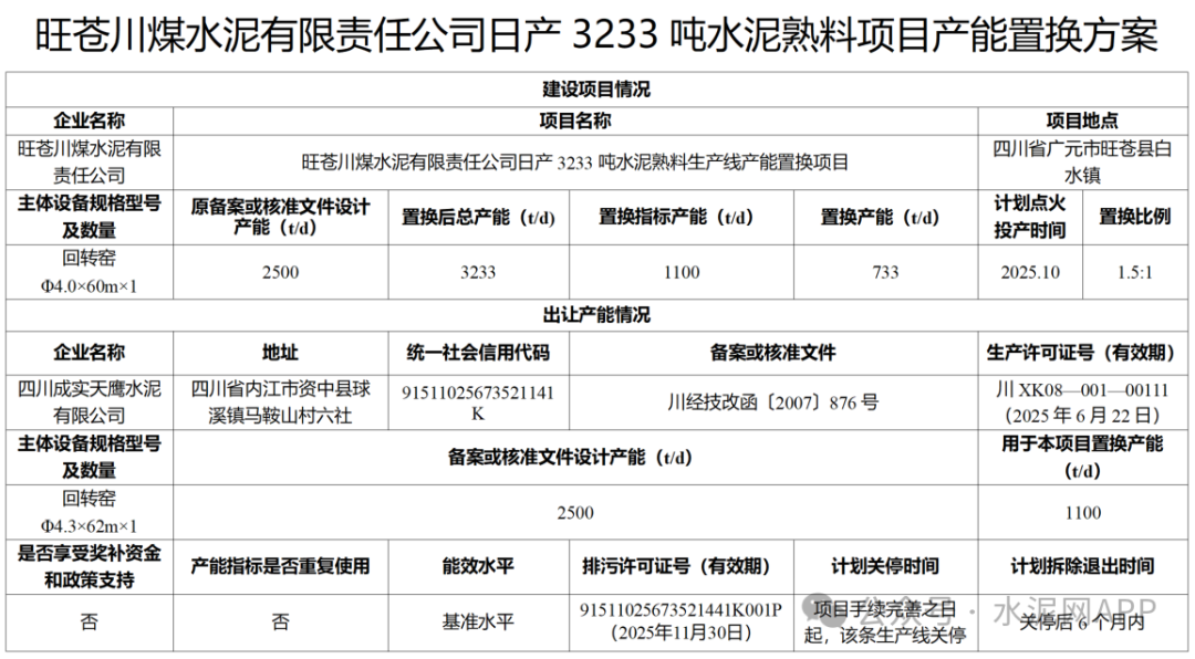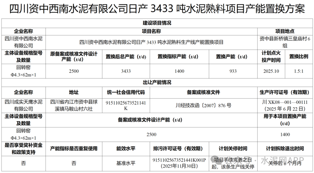 產能置換方案表顯示,四川成實天鷹水泥出讓2500t/d熟料產能,其中1400t/d產能用于置換補充四川資中西南水泥生產線,1100t/d產能用于置換補充旺蒼川煤水泥生產線,置換比例均為1.5:1。