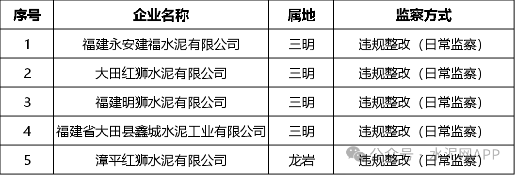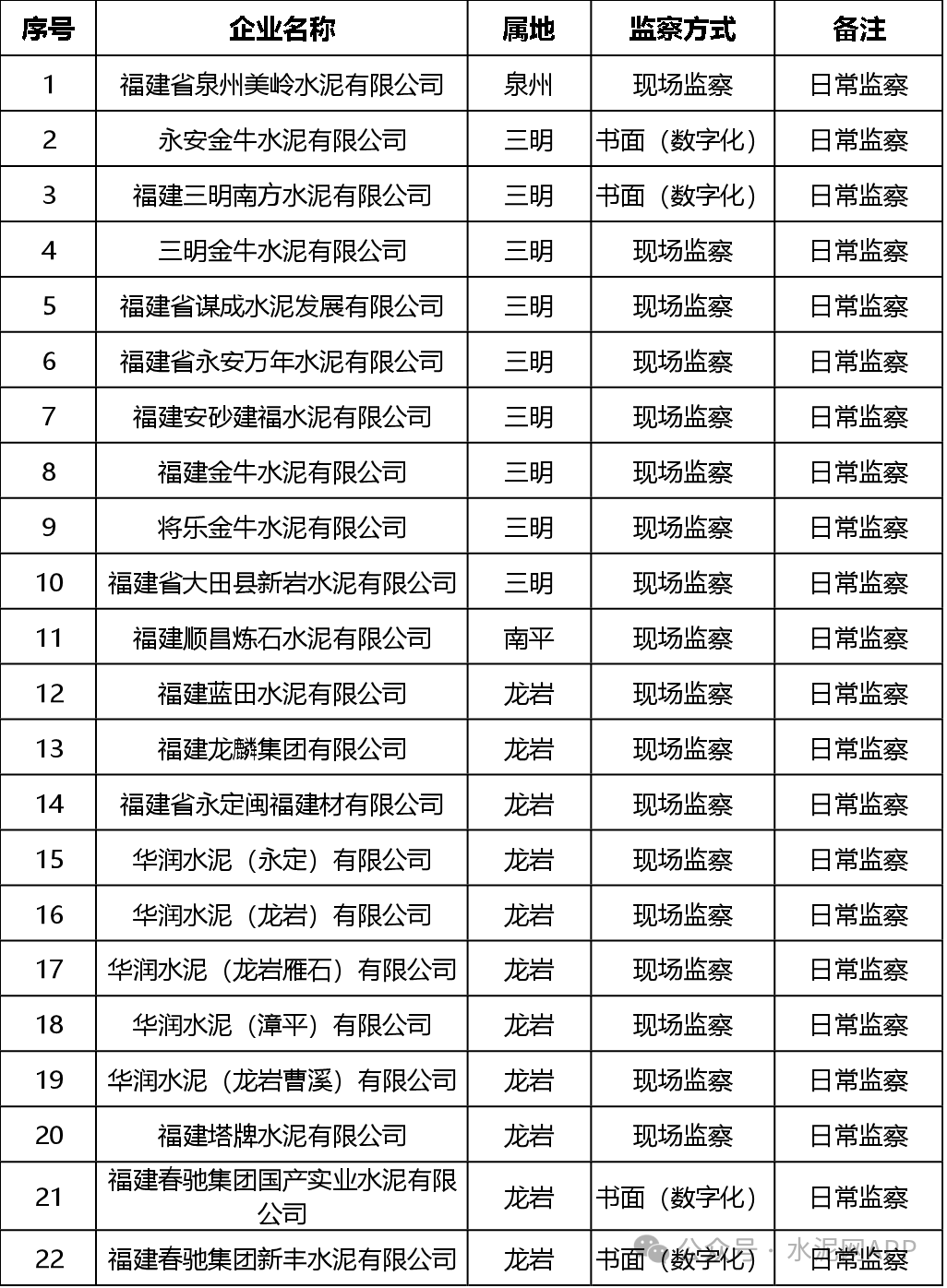 2025年福建省計(jì)劃開展重點(diǎn)用能企業(yè)工業(yè)節(jié)能監(jiān)察318家,其中省級監(jiān)察企業(yè)123家,市級監(jiān)察企業(yè)195家,采取現(xiàn)場監(jiān)察與書面(數(shù)字化)監(jiān)察結(jié)合的方式開展。其中水泥企業(yè)監(jiān)察名單整理如下: