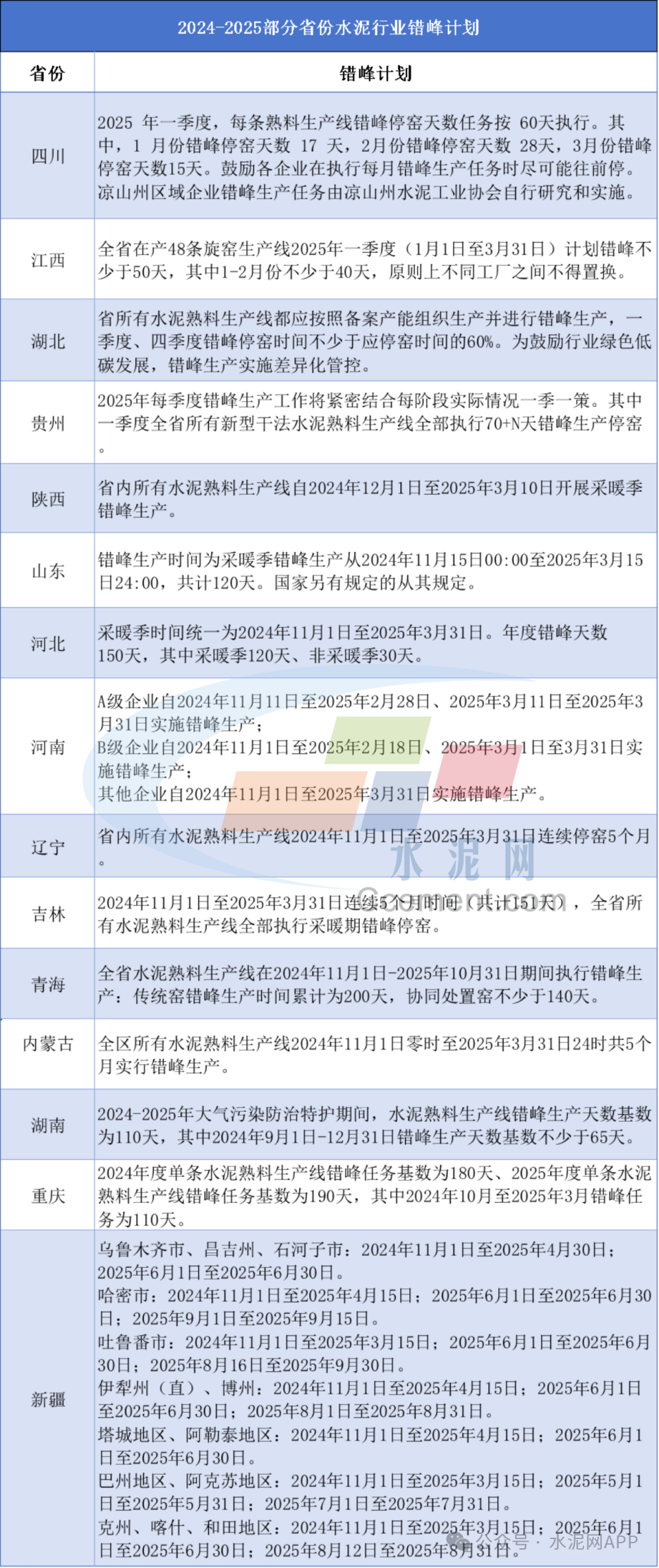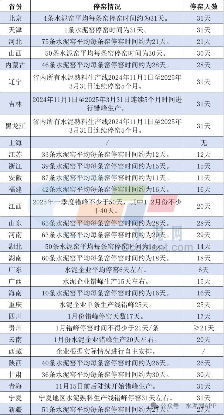 2025年部分省份水泥企業(yè)錯(cuò)峰計(jì)劃匯總見(jiàn)下表: