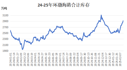 截至2月18日,秦皇島港5500大卡報價743元/噸,日環(huán)比下降3元/噸,已經(jīng)創(chuàng)下自2021年5月以來的新低;港口庫存方面,主產(chǎn)地煤礦陸續(xù)復(fù)產(chǎn),國有大礦產(chǎn)能已恢復(fù)至正常水平,且大秦線日運量提升至100-110萬噸,資源調(diào)入量持續(xù)增加,使得港口庫存壓力不斷提升,截至2月18日,環(huán)渤海港合計庫存已至2921.6萬噸,再次逼近3000萬大關(guān),且壘庫趨勢依舊。