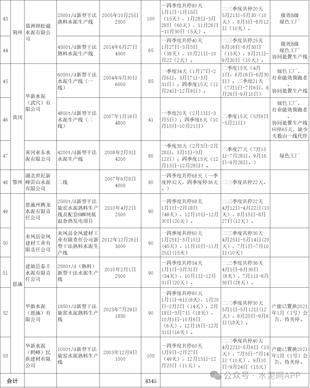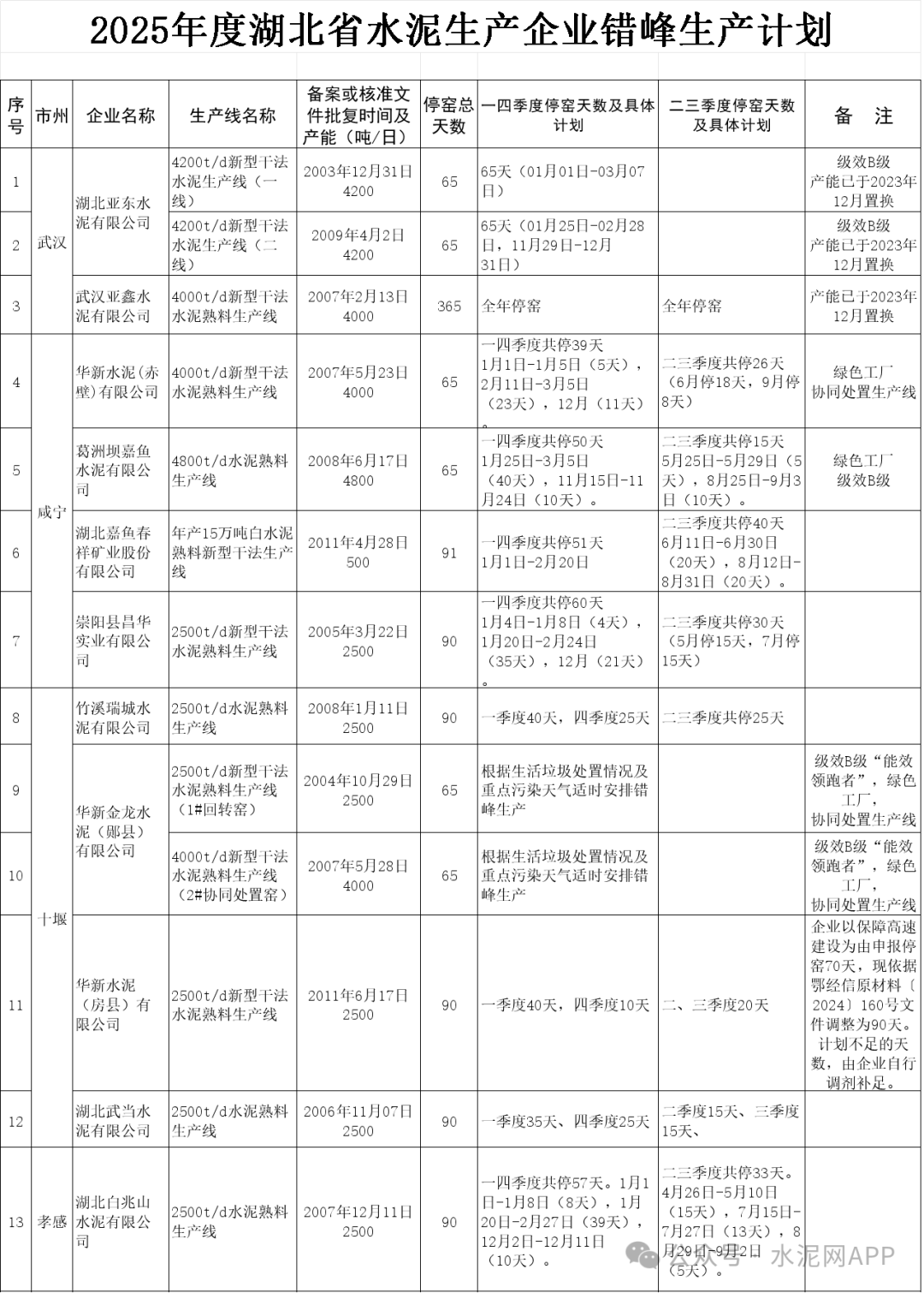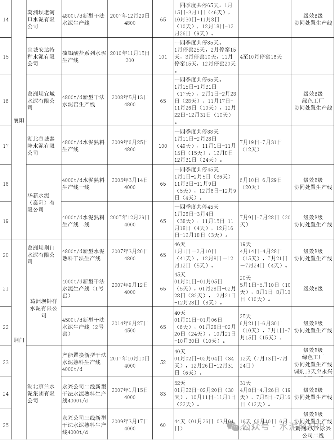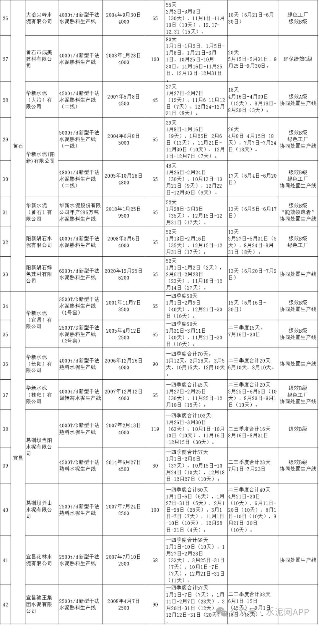 內(nèi)容顯示,武漢亞鑫水泥因產(chǎn)能已置換,全年停窯。其余水泥企業(yè)停窯時(shí)間為41天到119天之間。