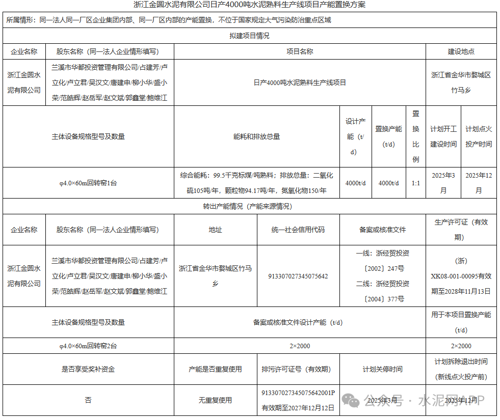 置換方案顯示,金圓水泥擬建4000t/d熟料生產(chǎn)線項目,出讓產(chǎn)能來自同公司2*2000t/d熟料生產(chǎn)線,置換比例1:1。項目計劃開工時間2025年3月,計劃點火時間2025年12月。