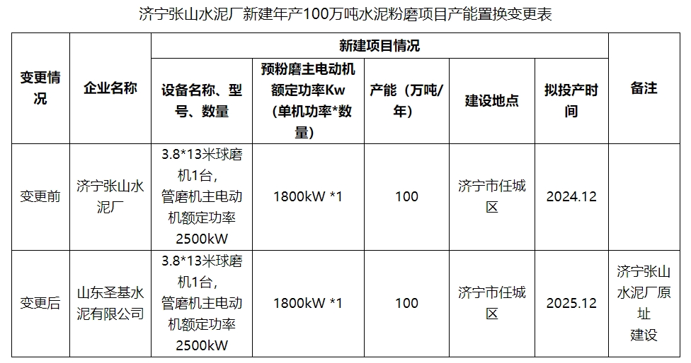 公告顯示,濟(jì)寧張山水泥廠新建年產(chǎn)100萬噸水泥粉磨項(xiàng)目擬變更產(chǎn)能置換實(shí)施主體為山東圣基水泥有限公司。
