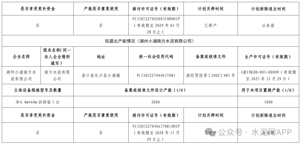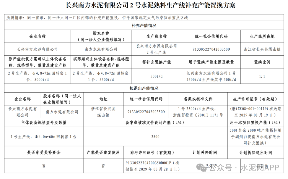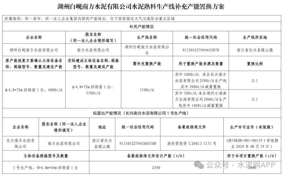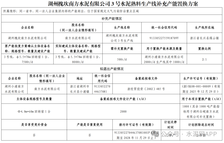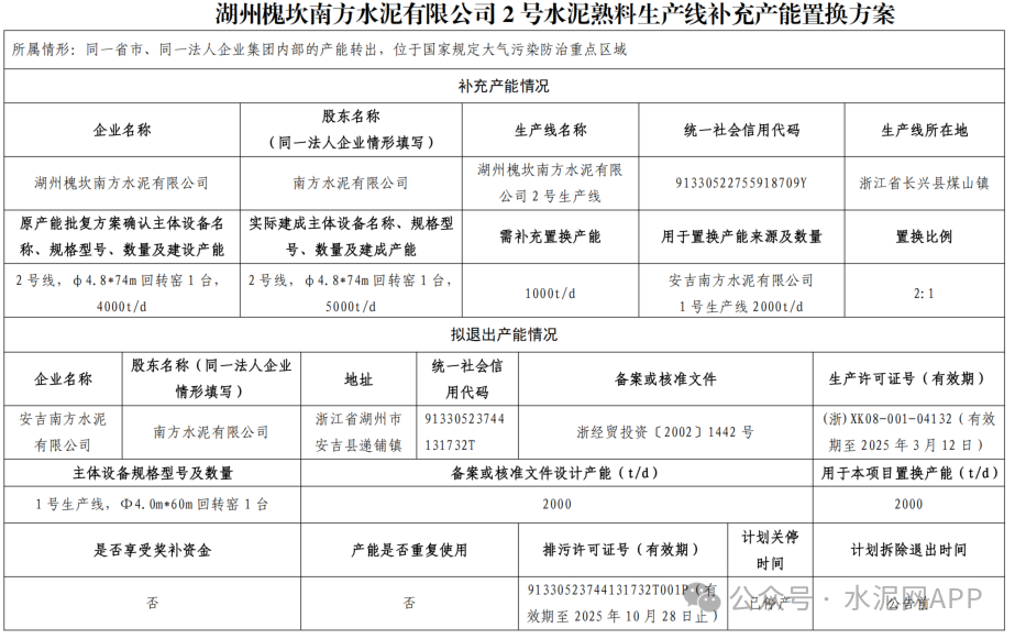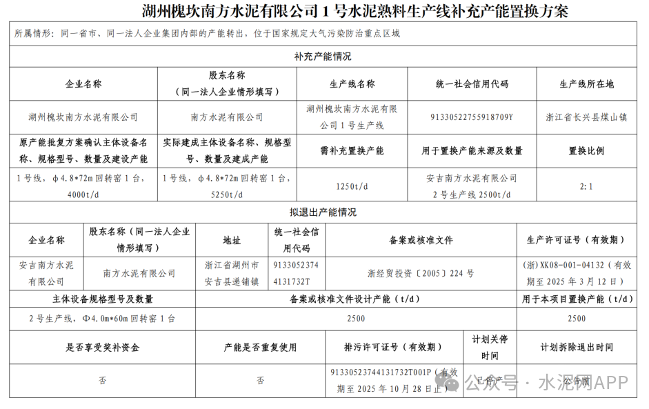 補充置換方案顯示:湖州槐坎南方水泥1號線置換補充產能1250t/d;湖州槐坎南方水泥2號線置換補充產能1000t/d;