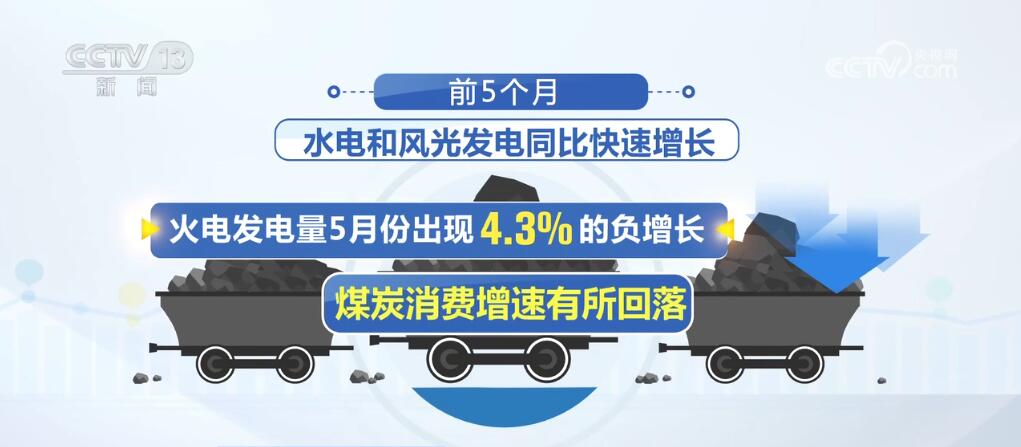 前5個月,水電和風(fēng)光發(fā)電同比快速增長,也讓火電發(fā)電量在5月份出現(xiàn)了4.3%的負(fù)增長,煤炭消費增速有所回落。