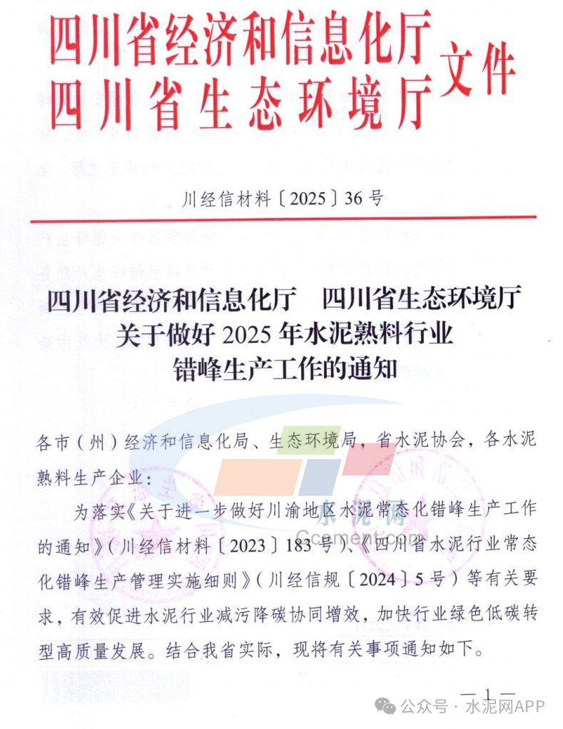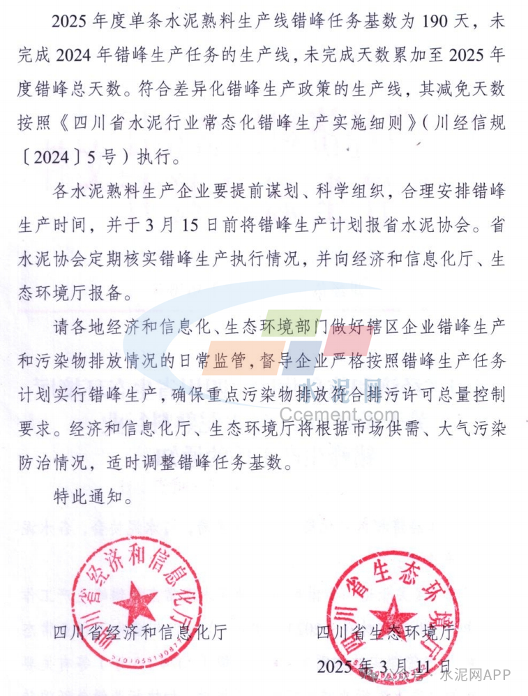 近日,四川省經(jīng)濟(jì)和信息化廳 四川省生態(tài)環(huán)境廳發(fā)布《關(guān)于做好2025年水泥熟料行業(yè)錯(cuò)峰生產(chǎn)工作的通知》。