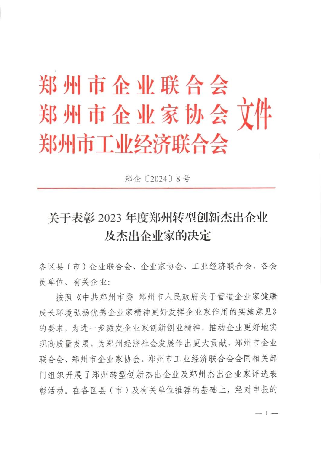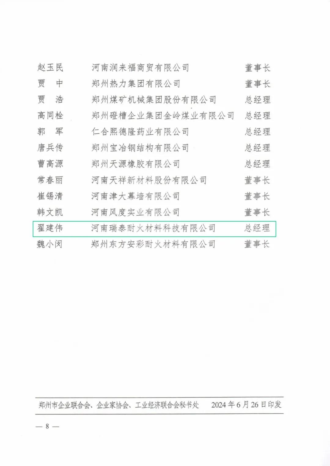 6月26日上午,2024年全國企業(yè)家活動日鄭州分會場活動在黃河迎賓館隆重舉行。河南瑞泰黨支部副書記、總經(jīng)理翟建偉榮獲“鄭州杰出企業(yè)家”稱號。
